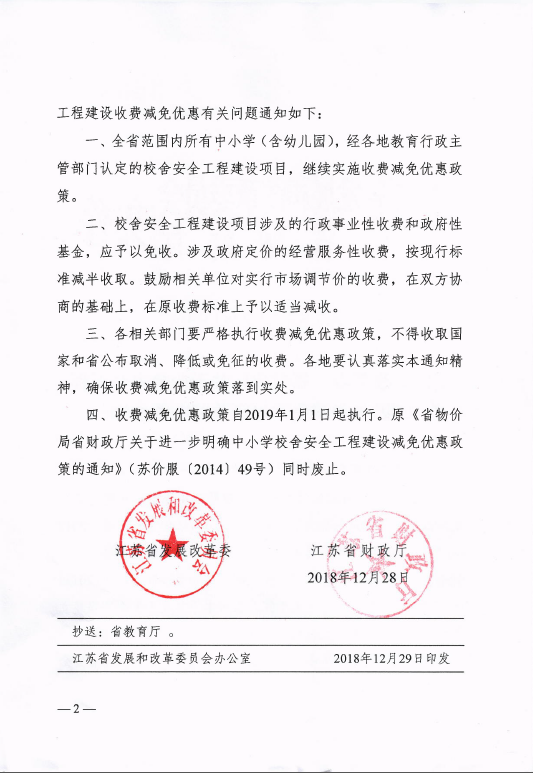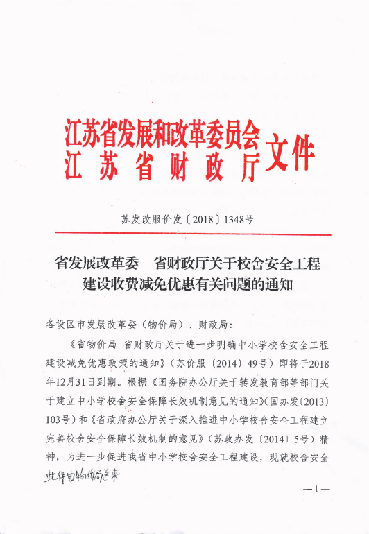 省发改委省财政厅关于校舍安全工程建设收费减免优惠有关问题的通知(苏发改服价发〔2018〕1348号)