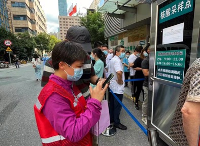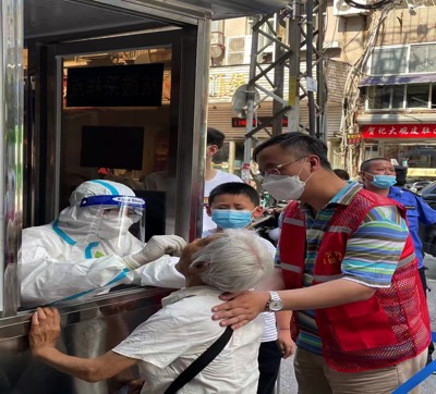 唱经楼社区居民结构复杂,在同仁社区卫生服务中心,前来开展核酸检测的既有八九十岁的老人、抱在怀里的幼儿,还有外籍人士以及行动不便的残障人士,费用征收中心党员志愿者们现场安排队伍、维持秩序、协助填写二维码信息,为社区完成全民核酸检测贡献力量。