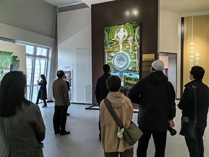南京宪法公园由旗阵广场、宣誓广场、宪法宣传教育展、主题雕塑、共享绿谷等部分组成。宪法宣传教育展陈馆外径100米、内径82米,总面积2857平方米,沿着总长约450米圆形廊道展线,随着60个重大法治事件的逐一展示,中国共产党百年法治历程在景墙上徐徐展开,通过图片图表、展品、多媒体等形式,全景式展示了中国共产党带领中国人民寻宪、制宪、修宪、奉宪的伟大历史进程。宪法宣传教育展楼下为宪法宣誓广场,四周景墙上设置大型组合浮雕,生动展示“国家象征”、“一切权力属于人民”、“宪法的‘人民性’与‘根本法’”三大主题。